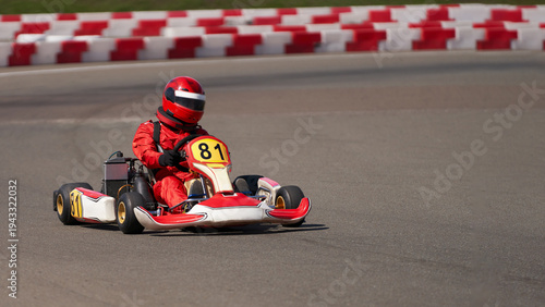 Children's karting. A child in red protective clothing and a protective helmet turns a racing car around a track.