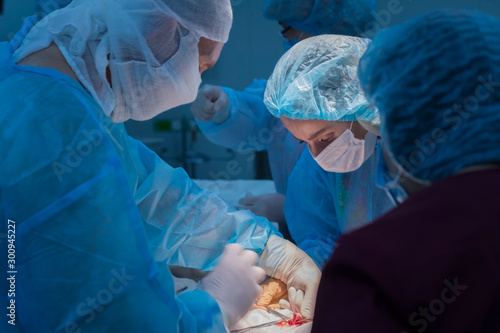 Children's surgeons perform urological surgery. A man and a woman in a mask, and a blue sterile gown, in the operating room.