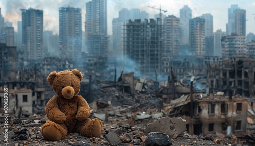 Children's teddy bear symbolizes war conflicts in a banner.