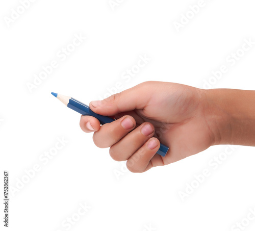 Childs hand holding a blue colored pencil, isolated on white background.
