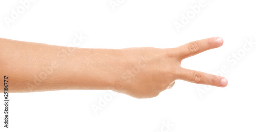 Child's hand showing two fingers on white background