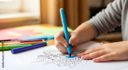 Childs hands drawing colorful artwork using felt tip pens creative hobby leisure activity fun imagination art supplies