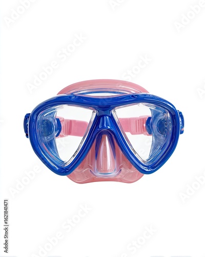 Child's snorkeling mask, blue and pink, front view. Clear lenses, adjustable straps
