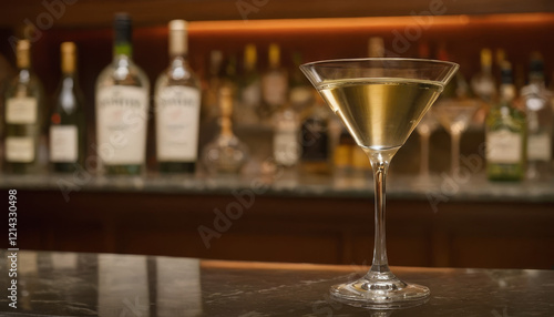 Chilled martini on a marble countertop with blurred bar shelves