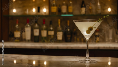 Chilled martini on a marble countertop with blurred bar shelves