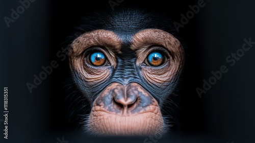 Chimpanzee Portrait: A captivating close-up of a chimpanzee's face, showcasing its mesmerizing blue eyes and intricate details. The dark background creates a sense of depth and mystery.
