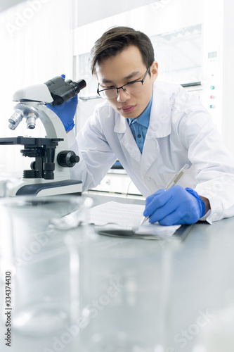 Chinese male lab worker in gloves and whitecoat making notes in notepad