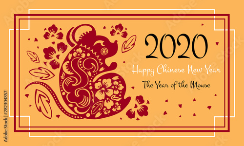 Chinese New Year 2020 print and web banner template. The Year of the Mouse or Rat. Vector papercut silhouette illustration with mouse and flowers