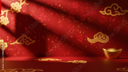 Chinese New Year background with red walls, gold clouds, traditional ornaments, and sunlight for product display