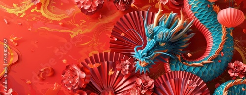 Chinese new year banner abstract art with oriental dragon and folding paper fans on red