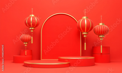 Chinese red background, 3D award podium, luxury Chinese new year product stage, Chinese product display background, red award podium, abstract light studio, Asian circle shape, happy, modern