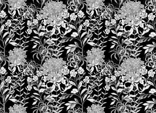 Chinoiserie inspired. Vintage floral illustration. Black and white oriental eastern asian