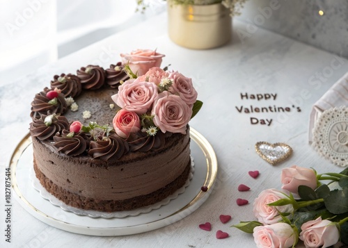 Chocolate Cake with Pink Roses for Valentine's Day Celebration on a Light Background