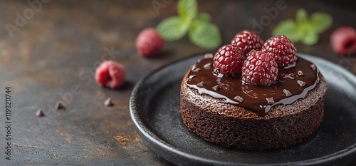 Chocolate cake with raspberries, dark background. Dessert recipe