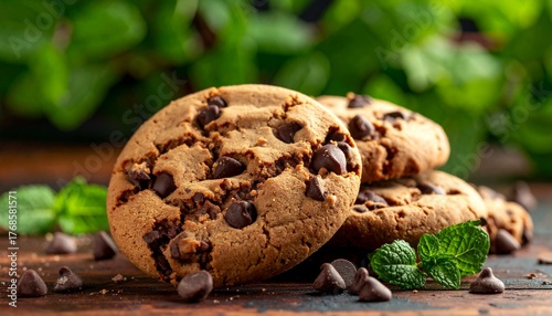 Chocolate Chip Cookies Stacked on Wooden Surface with Mint Leaves Background