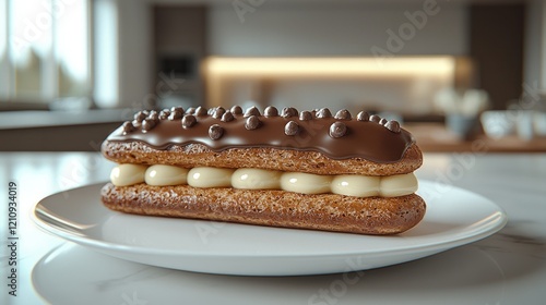 Chocolate ?clair, kitchen background, dessert, plate, food photography