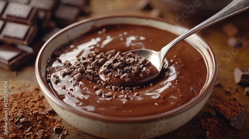 Chocolate in bowl, with spoon, chunks and powder scattered on wooden table
