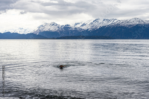 Chocolate lab playing on the rocky beach of Katchemak Bay on a cloudy day, Homer, AK