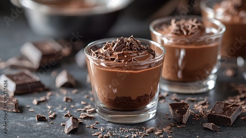 chocolate mousse desserts in a glass with chocolate pieces