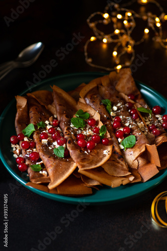 Chocolate pancakes or crepes with cranberries and nuts, served on a green plate. Winter holidays breakfast concept. Breakfast for Christmas and New Year. Dark background