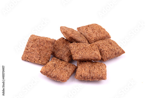 chocolate pillows for breakfast isolated on white background. Brown choco cereal pads with cream