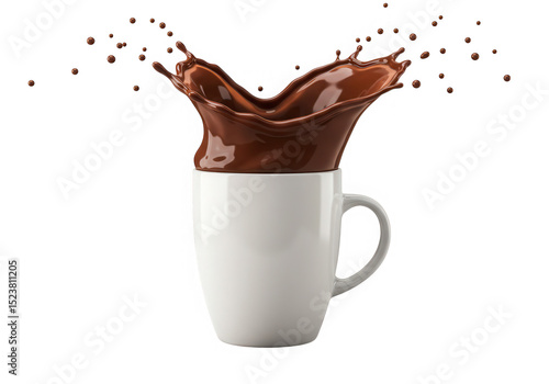 Chocolate splash in white mug isolated on transparent background