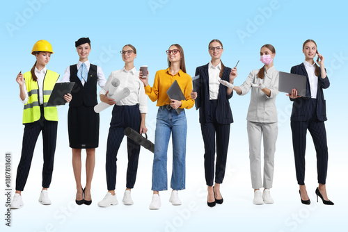 Choice of profession. Same woman representing different occupations. Collage of portraits on light blue gradient background