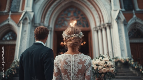 Christian Bride And Groom. Beautiful Couple Standing By Catholic Church. Wedding Celebration Concept