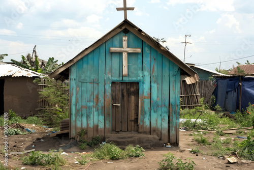 Christian Church in Poor Village made of rustic mud and wood as a place of worship and faith among struggling believers