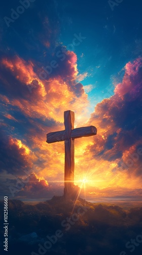 Christian Cross Symbolizing Easter and Resurrection: Dramatic Lighting Against a Colorful Mountain Sunset with Dark Clouds and Sunbeams