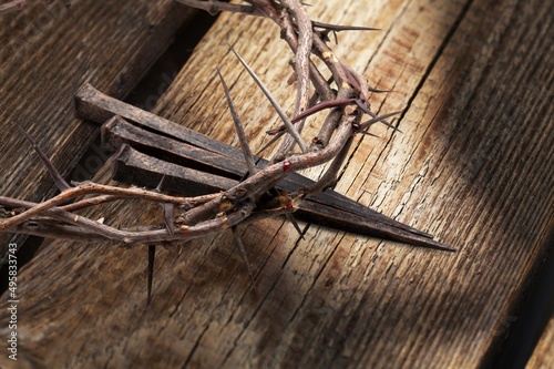 Christian crown of thorns with metal nails on a wooden desk