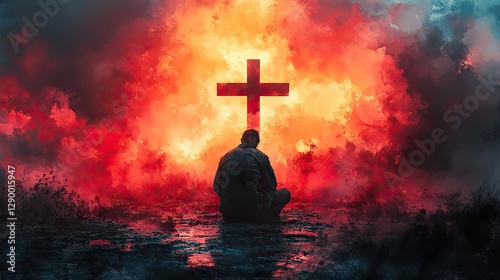 christian man kneeling in front of the cross christian religion concept digital watercolor painting