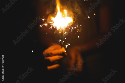 Christmas and new year eve concept image with close up of a pair of man hands taking a red fire sparkler to celebrate the night party - focus on fireworks and hope for people future