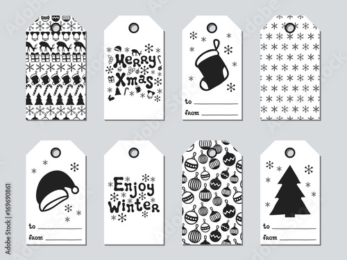 Christmas and New Year gift tags. Cards xmas set. Hand drawn elements. Collection of holiday paper label in black and white. Seasonal badge sale design. Texture. Print. Vector illustration. Lettering.