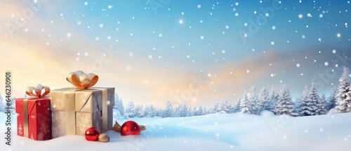 Christmas background. Gift and ball in forest against a blue sky in a snowfall. panorama view. Beautiful Festive Christmas snowy background. copy space.