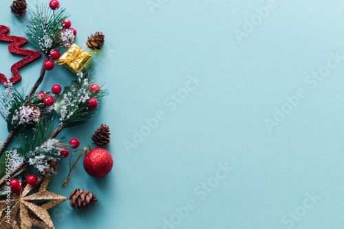Christmas background with Christmas tree, cones, toys and more on blue background. Christmas greeting card. The theme of the winter holiday happy new year selective focus