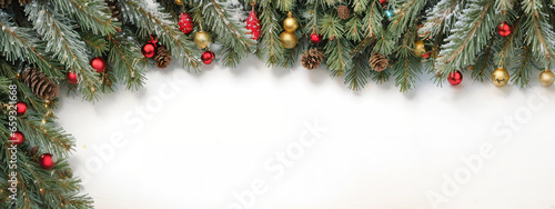 Christmas banner. Top view of winter twigs, cones and red mistletoe fruits with copy space, winter and christmas business advertising space, Merry Christmas web header with a white background,