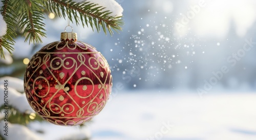Christmas bauble hanging on snow-covered fir branch outdoors