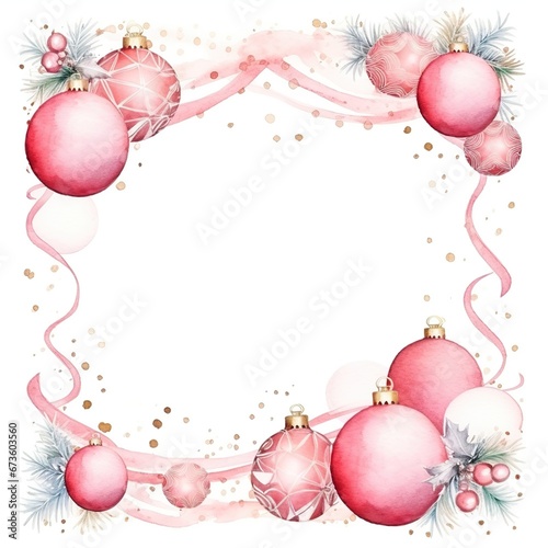 Christmas border with pink balls on white background. Watercolor Christmas and New Year background