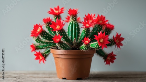 Christmas cactus with red blooms in a brown plastic pot on a light background