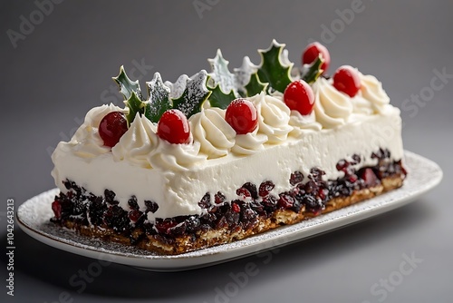 Christmas cake with white cream and holly, a traditional English fruitcake