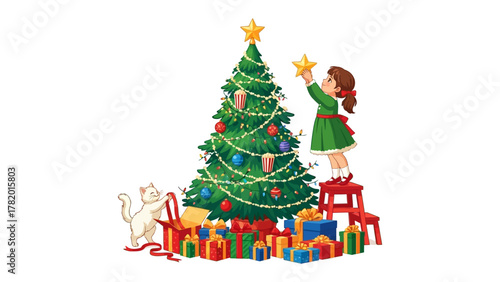 Christmas Cheer: A young girl, full of holiday spirit, adorns a Christmas tree with a golden star, while a playful cat assists. Capturing the essence of the festive season.