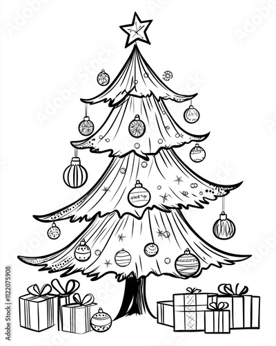 Christmas Coloring Page Featuring Christmas Tree and Gifts – Festive Holiday Design - Line Art - Printable Pages