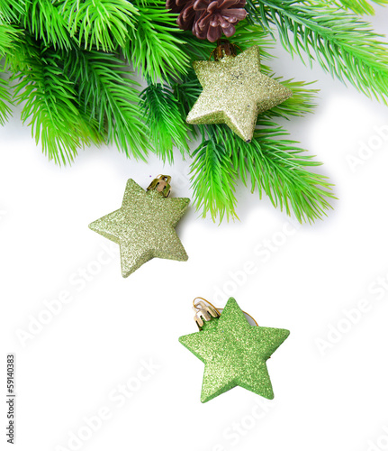 Christmas decorative stars on fir tree, isolated on white