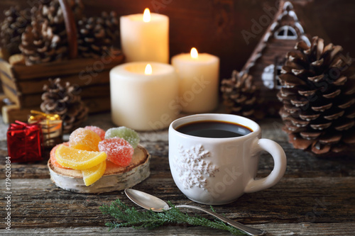 Christmas drink: coffee, colorful candy and burning candles