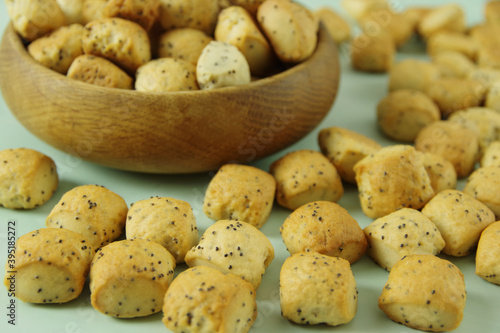 Christmas Eve cookies Kūčiukai (also Šližikai) in a wooden bowl. Kūčiukai are served during Christmas Eve dinner in Lithuania. Kūčiukai are eaten with poppy milk.