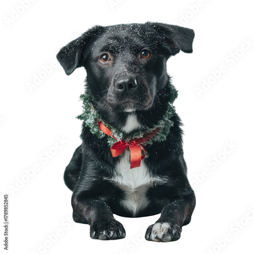 christmas festival Black dog with a red collar and a curious expression.