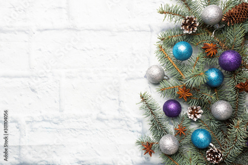 Christmas frame made of fir, Christmas tree decorations in silver and blue on a light brick background. Copy space. Flat lay.