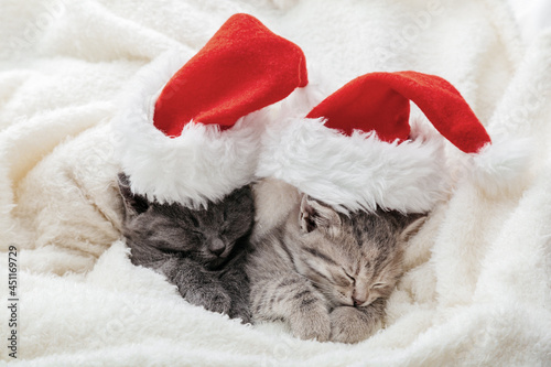 Christmas gray tabby cats nap. New Year couple of kittens hugging and sleeping. Christmas Kittens in santa claus hat portrait wrapped up in soft fluffy white plaid.