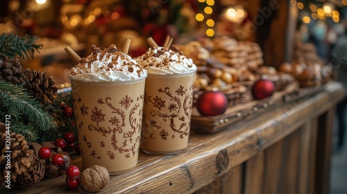 [Christmas Holiday Scene With White Mugs And Whipped Cream] Winter Wonderland Holiday Coffee Table Setup